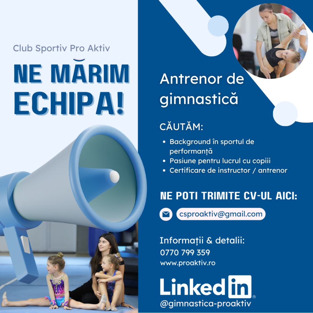 Ești pasionată de mișcare și lucrul cu copiii? Clubul nostru sportiv, afiliat la Federația Română de Gimnastică Ritmică (FRGR), își mărește echipa! Căutăm o persoană entuziastă care să ghideze primii pași ai micilor gimnaste în lumea sportului de performanță.
